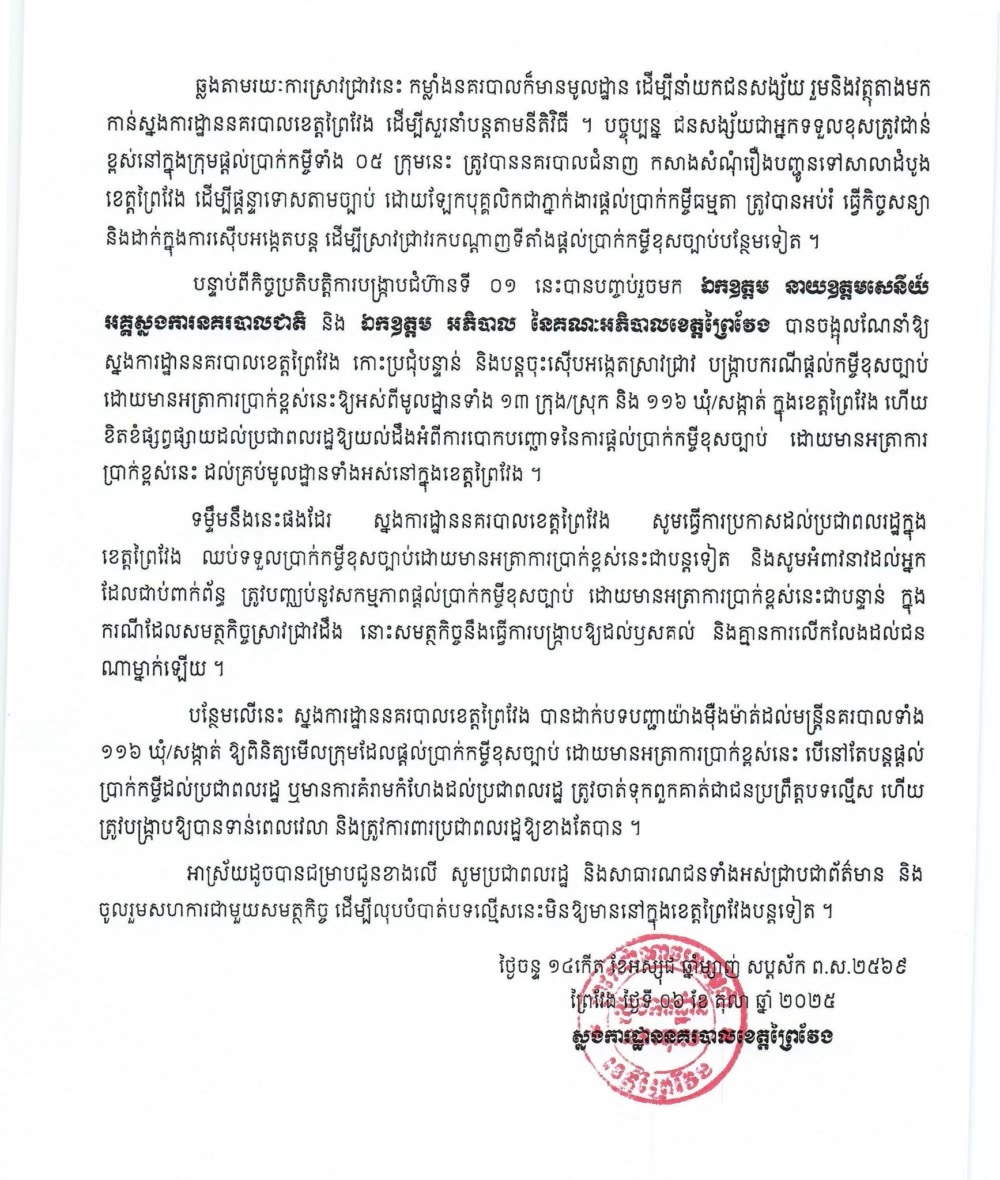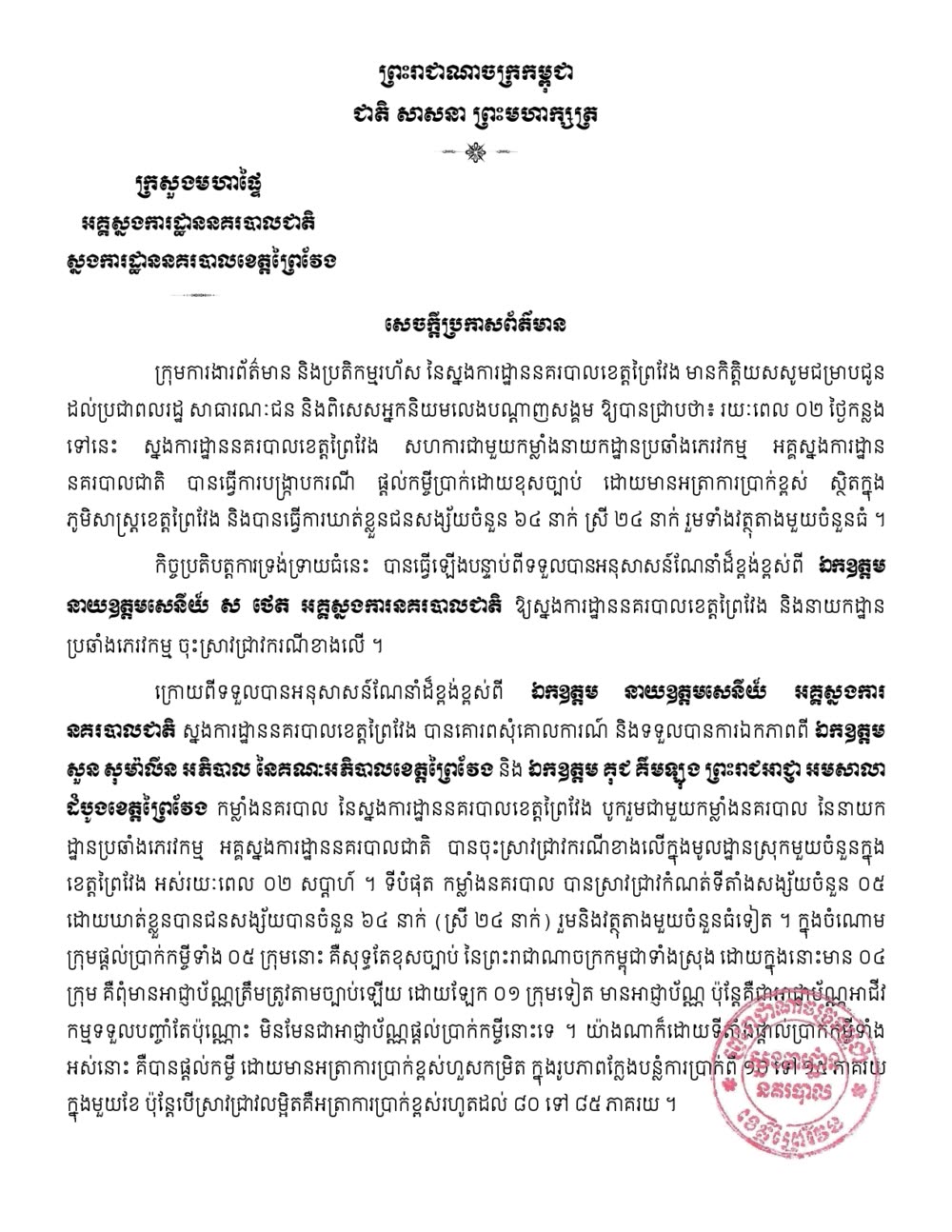 កម្លាំងនគរបាលខេត្តព្រៃវែង បូករួមជាមួយកម្លាំងនគរបាល នៃនាយកដ្ឋានប្រឆាំងភេរវកម្ម អគ្គស្នងការដ្ឋាននគរបាលជាតិ បានចុះស្រាវជ្រាវករណីផ្ដល់កម្ចីប្រាក់ដោយខុសច្បាប់ ដោយមានអត្រាការប្រាក់ខ្ពស់ ក្នុងមូលដ្ឋានស្រុកមួយចំនួនក្នុងខេត្តព្រៃវែង អស់រយៈពេល ០២ សប្តាហ៍ ទីបំផុតបានស្រាវជ្រាវកំណត់ទីតាំងសង្ស័យចំនួន០៥ ដោយឃាត់ខ្លួនបានជនសង្ស័យបានចំនួន ៦៤នាក់ (ស្រី ២៤ នាក់) រួមនិងវត្ថុតាងមួយចំនួនធំទៀត។