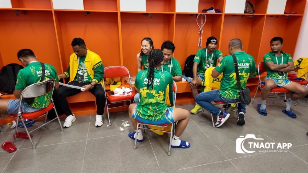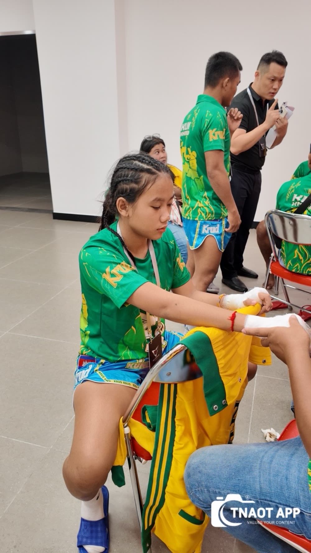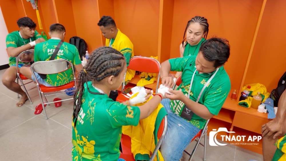 សកម្មភាពអ្នកលេងគុនខ្មែរជួរមុខកម្ពុជា កំពុងរុំដៃ និងរៀបចំខ្លួនត្រៀមឡើងប្រកួតជាមួយកីឡាករចិន នៅក្នុងព្រឹត្តការណ៍ ព្រឹត្តិការណ៍ សង្វៀង “Krud Kun Khmer To China 2