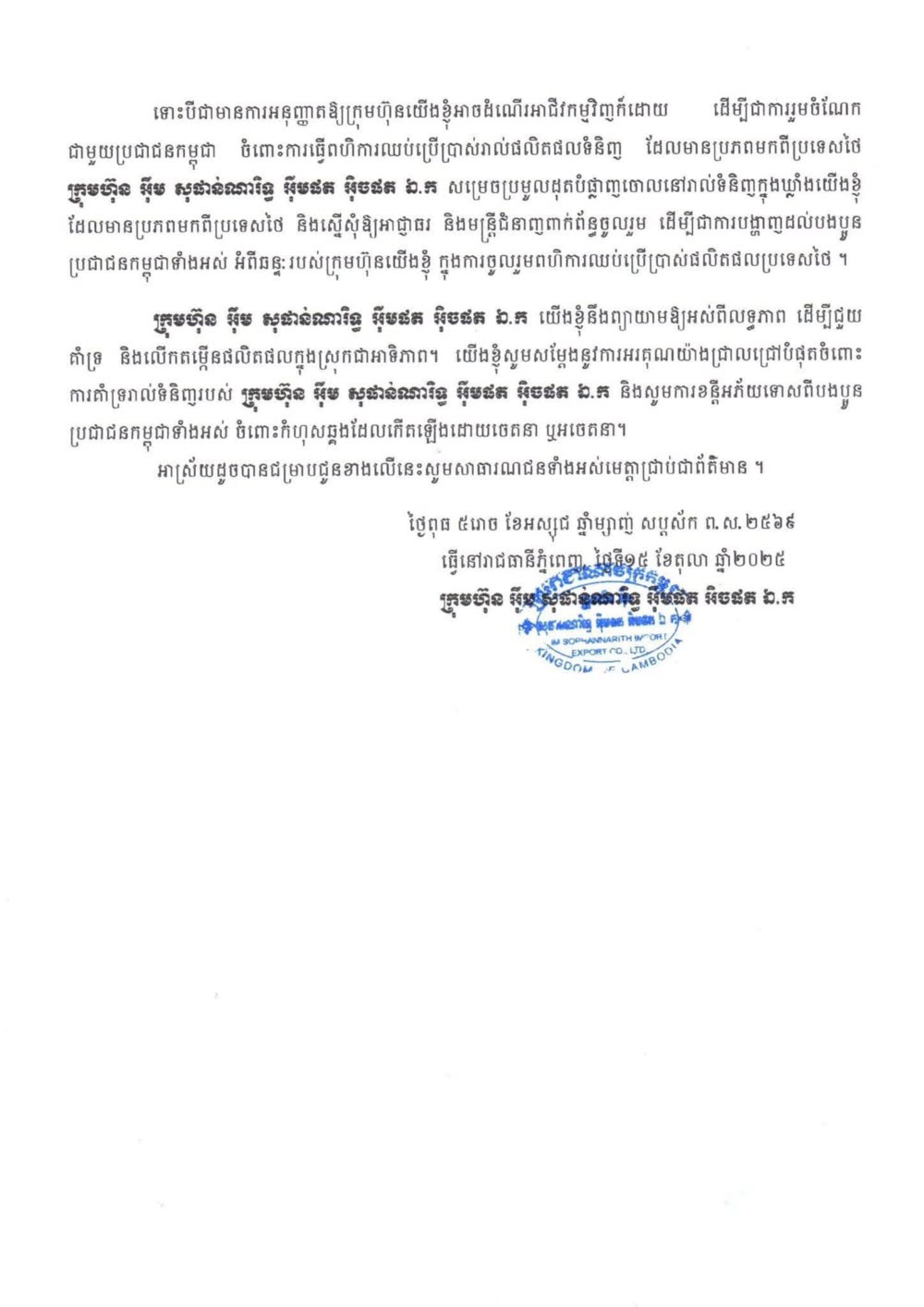 ទោះបីជាមានការអនុញ្ញាតឱ្យក្រុមហ៊ុនយើងខ្ញុំអាចដំណើរអាជីវកម្មវិញក៏ដោយ ដើម្បីជាការរួមចំណែក ជាមួយប្រជាជនកម្ពុជា ចំពោះការធ្វើពហិការឈប់ប្រើប្រាស់រាល់ផលិតផលទំនិញ ដែលមានប្រភពមកពីប្រទេសថៃ ក្រុមហ៊ុន អ៉ឹម សុផាន់ណារិទ្ធ អ៊ីមផត អិចផត ឯ.ក សម្រេចប្រមូលដុតបំផ្លាញចោលនៅរាល់ទំនិញក្នុងឃ្លាំងយើងខ្ញុំ ដែលមានប្រភពមកពីប្រទេសថៃ និងស្នើសុំឱ្យអាជ្ញាធរ និងមន្ត្រីជំនាញពាក់ព័ន្ធចូលរួម ដើម្បីជាការបង្ហាញដល់បងប្អូន ប្រជាជនកម្ពុជាទាំងអស់ អំពីឆន្ទៈរបស់ក្រុមហ៊ុនយើងខ្ញុំ ក្នុងការចូលរួមពហិការឈប់ប្រើប្រាស់ផលិតផលប្រទេសថៃ៕