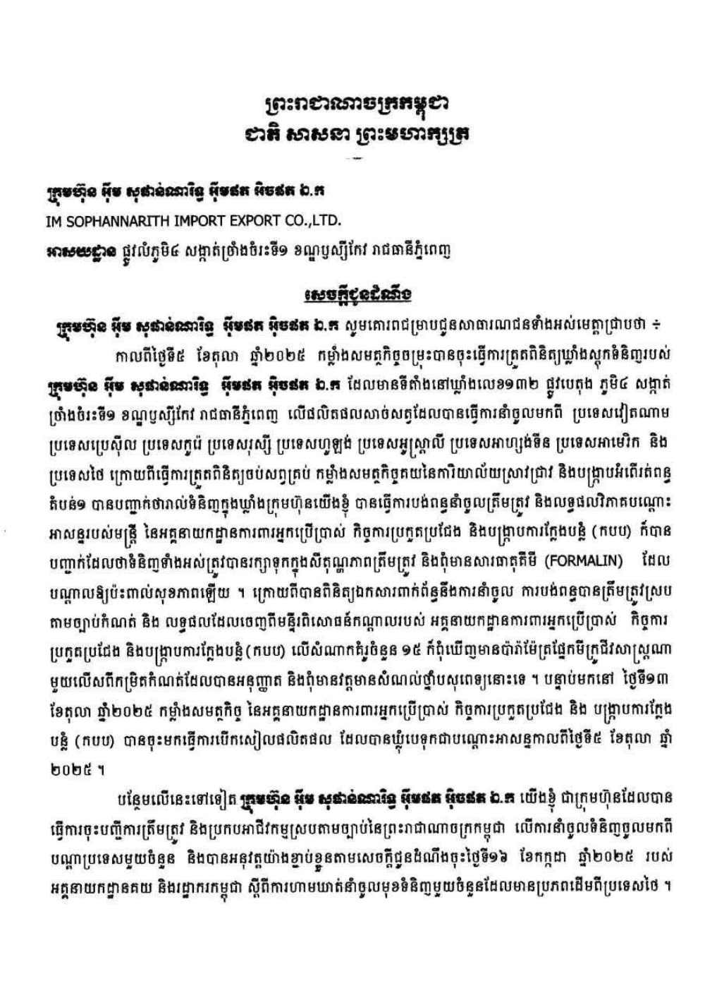 ដោយកាលពីថ្ងៃទី៥ ខែតុលា ឆ្នាំ២០២៥ កម្លាំងសមត្ថកិច្ចចម្រុះបានចុះធ្វើការត្រួតពិនិត្យឃ្លាំងស្តុកទំនិញរបស់ ក្រុមហ៊ុន អ៉ឹម សុផាន់ណារិទ្ធ អ៊ីមផត អិចផត ឯ.ក ដែលមានទីតាំងនៅឃ្លាំងលេខ១៣២ ផ្លូវបេតុង ភូមិ៤ សង្កាត់ ច្រាំងចំរះទី១ ខណ្ឌឫស្សីកែវ រាជធានីភ្នំពេញ លើផលិតផលសាច់សត្វដែលបានធ្វើការនាំចូលមកពី ប្រទេសវៀតណាម ប្រទេសប្រេស៊ីល ប្រទេសកូរ៉េ ប្រទេសរុស្សី ប្រទេសហូឡង់ ប្រទេសអូស្ត្រាលី ប្រទេសអាហ្សង់ទីន ប្រទេសអាមេរិក និង ប្រទេសថៃ ក្រោយពីធ្វើការត្រួតពិនិត្យចប់សព្វគ្រប់ កម្លាំងសមត្ថកិច្ចបានបញ្ជាក់ថារាល់ទំនិញក្នុងឃ្លាំងក្រុមហ៊ុនយើងខ្ញុំ បានធ្វើការបង់ពន្ធនាំចូលត្រឹមត្រូវ និងលទ្ធផលវិភាគបណ្តោះអាសន្នរបស់មន្ត្រី នៃអគ្គនាយកដ្ឋានការពារអ្នកប្រើប្រាស់ កិច្ចការប្រកួតប្រជែង និងបង្ក្រាបការក្លែងបន្លំ (កបប) ក៏បានបញ្ជាក់ដែលថាទំនិញទាំងអស់ត្រូវបានរក្សាទុកក្នុងសីតុណ្ហភាពត្រឹមត្រូវ និងពុំមានសារធាតុគីមី (FORMALIN) ដែល បណ្តាលឱ្យប៉ះពាល់សុខភាពឡើយ។