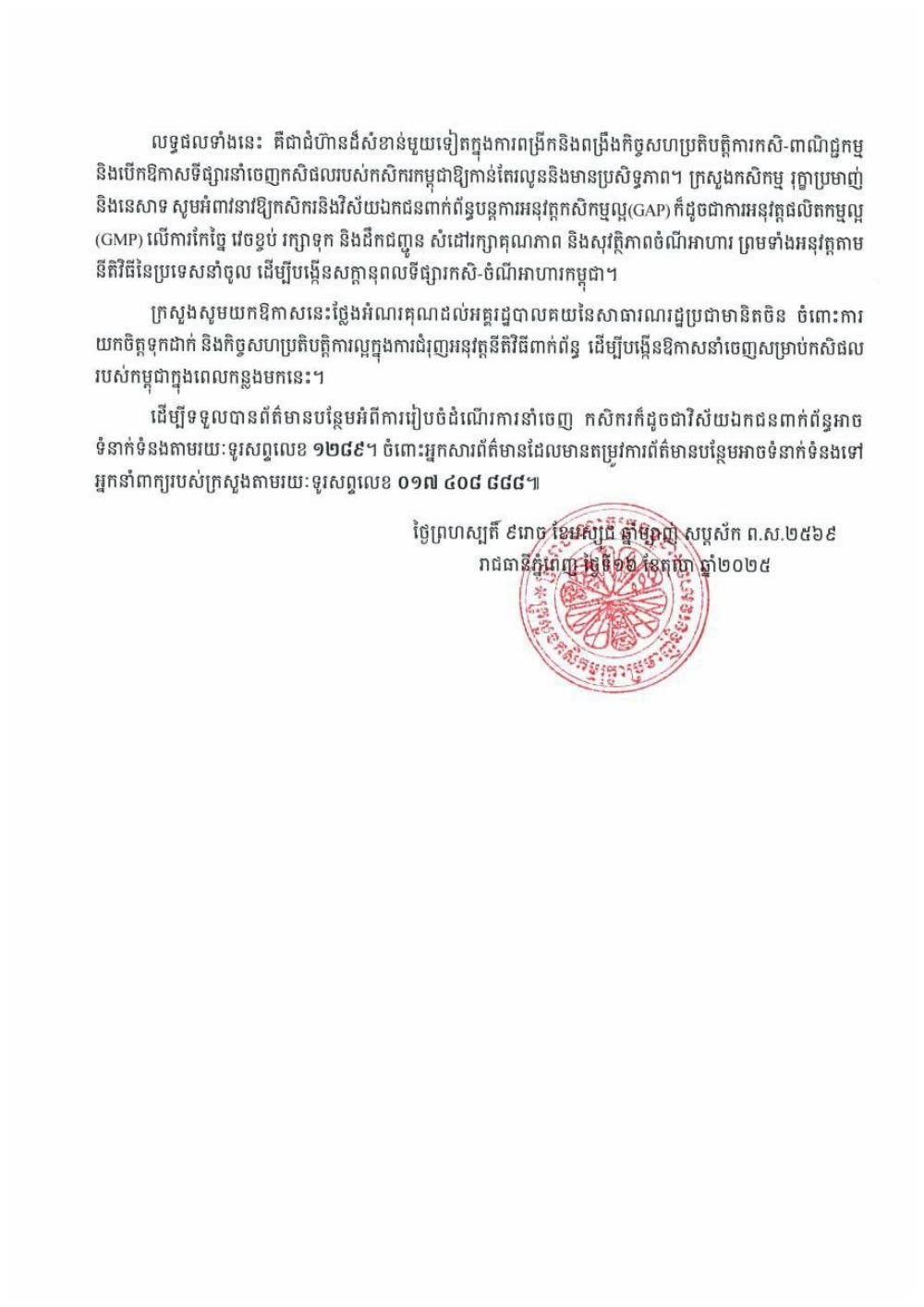 លទ្ធផលទាំងនេះ គឺជាជំហ៊ានដ៏សំខាន់មួយទៀតក្នុងការពង្រីកនិងពង្រឹងកិច្ចសហប្រតិបត្តិការកសិ-ពាណិជ្ជកម្ម និងបើកឱកាសទីផ្សារនាំចេញកសិផលរបស់កសិករកម្ពុជាឱ្យកាន់តែរលូននិងមានប្រសិទ្ធភាព។ ក្រសួងកសិកម្ម រុក្ខាប្រមាញ់ និងនេសាទ អំពាវនាវឱ្យកសិករនិងវិស័យឯកជនពាក់ព័ន្ធបន្តការអនុវត្តកសិកម្មល្អ(GAP) ក៏ដូចជាការអនុវត្តផលិតកម្មល្អ (GMP) លើការកែច្នៃ វេចខ្ចប់ រក្សាទុក និងដឹកជញ្ជូន សំដៅរក្សាគុណភាព និងសុវត្ថិភាពចំណីអាហារ ព្រមទាំងអនុវត្តតាម នីតិវិធីនៃប្រទេសនាំចូល ដើម្បីបង្កើនសក្តានុពលទីផ្សារកសិ-ចំណីអាហារកម្ពុជា៕