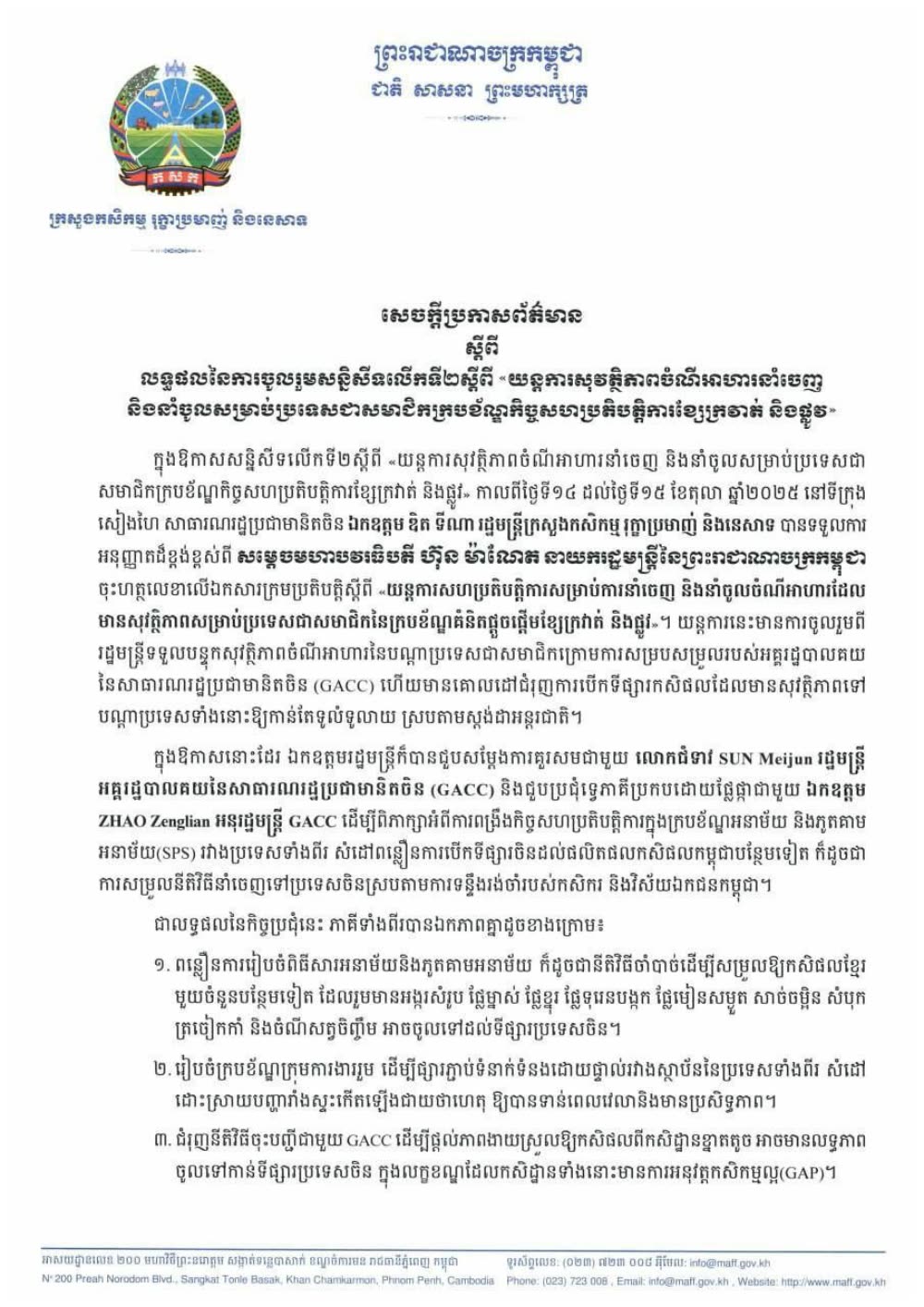 ជាលទ្ធផលនៃកិច្ចប្រជុំនេះ ភាគីទាំងពីរបានឯកភាពគ្នា ជំរុញនីតិវិធីចុះបញ្ជីជាមួយ GACC ដើម្បីផ្តល់ភាពងាយស្រួលឱ្យកសិផលពីកសិដ្ឋានខ្នាតតូច អាចមានលទ្ធភាព ចូលទៅកាន់ទីផ្សារប្រទេសចិន ក្នុងលក្ខខណ្ឌដែលកសិដ្ឋានទាំងនោះមានការអនុវត្តកសិកម្មល្អ(GAP)។ ពន្លឿនការរៀបចំពិធីសារអនាម័យនិងភូតគាមអនាម័យ ក៏ដូចជានីតិវិធីចាំបាច់ដើម្បីសម្រួលឱ្យកសិផលខ្មែរ មួយចំនួនបន្ថែមទៀត ដែលរួមមានអង្ករសំរូប ផ្លែម្នាស់ ផ្លែខ្នុរ ផ្លែទុរេនបង្កក ផ្លែមៀនសមូត សាច់ចម្អិន សំបុក ត្រចៀកកាំ និងចំណីសត្វចិញ្ចឹម អាចចូលទៅដល់ទីផ្សារប្រទេសចិន និងរៀបចំក្របខ័ណ្ឌក្រុមការងាររួម ដើម្បីផ្សារភ្ជាប់ទំនាក់ទំនងដោយផ្ទាល់រវាងស្ថាប័ននៃប្រទេសទាំងពីរ សំដៅ ដោះស្រាយបញ្ហារាំងស្ទះកើតឡើងជាយថាហេតុ ឱ្យបានទាន់ពេលវេលានិងមានប្រសិទ្ធភាព។