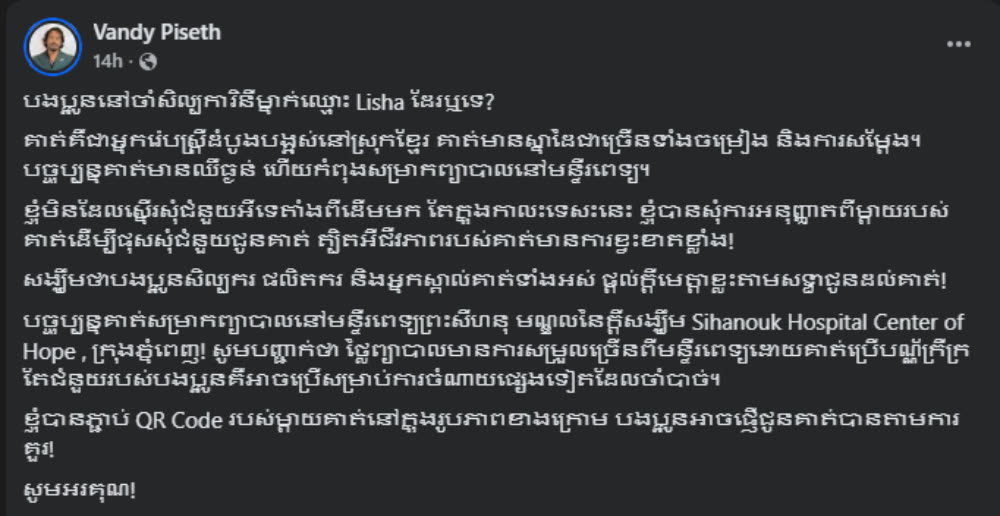 នេះយោងតាមសំណេររបស់របស់គណនីមួយឈ្មោះ Vandy Piseth បានរៀបរាប់បែបនេះថា៖ «បងប្អូននៅចាំសិល្បការិនីម្នាក់ឈ្មោះ Lisha ដែរឬទេ? គាត់គឺជាអ្នករ៉េបស្រ្តីដំបូងបង្អស់នៅស្រុកខ្មែរ គាត់មានស្នាដៃជាច្រើនទាំងចម្រៀង និងការសម្តែង បច្ចុប្បន្នគាត់មានឈឺធ្ងន់ ហើយកំពុងសម្រាកព្យាបាលនៅមន្ទីរពេទ្យ។ ខ្ញុំមិនដែលស្នើរសុំជំនួយអីទេតាំងពីដើមមក តែក្នុងកាលះទេសះនេះ ខ្ញុំបានសុំការអនុញ្ញាតពីម្តាយរបស់គាត់ដើម្បីផុសសុំជំនួយជូនគាត់ ត្បិតអីជីវភាពរបស់គាត់មានការខ្វះខាតខ្លាំង!សង្ឃឹមថាបងប្អូនសិល្បករ ផលិតករ និងអ្នកស្គាល់គាត់ទាំងអស់ ផ្តល់ក្តីមេត្តាខ្លះតាមសទ្ធាជូនដល់គាត់!»។
