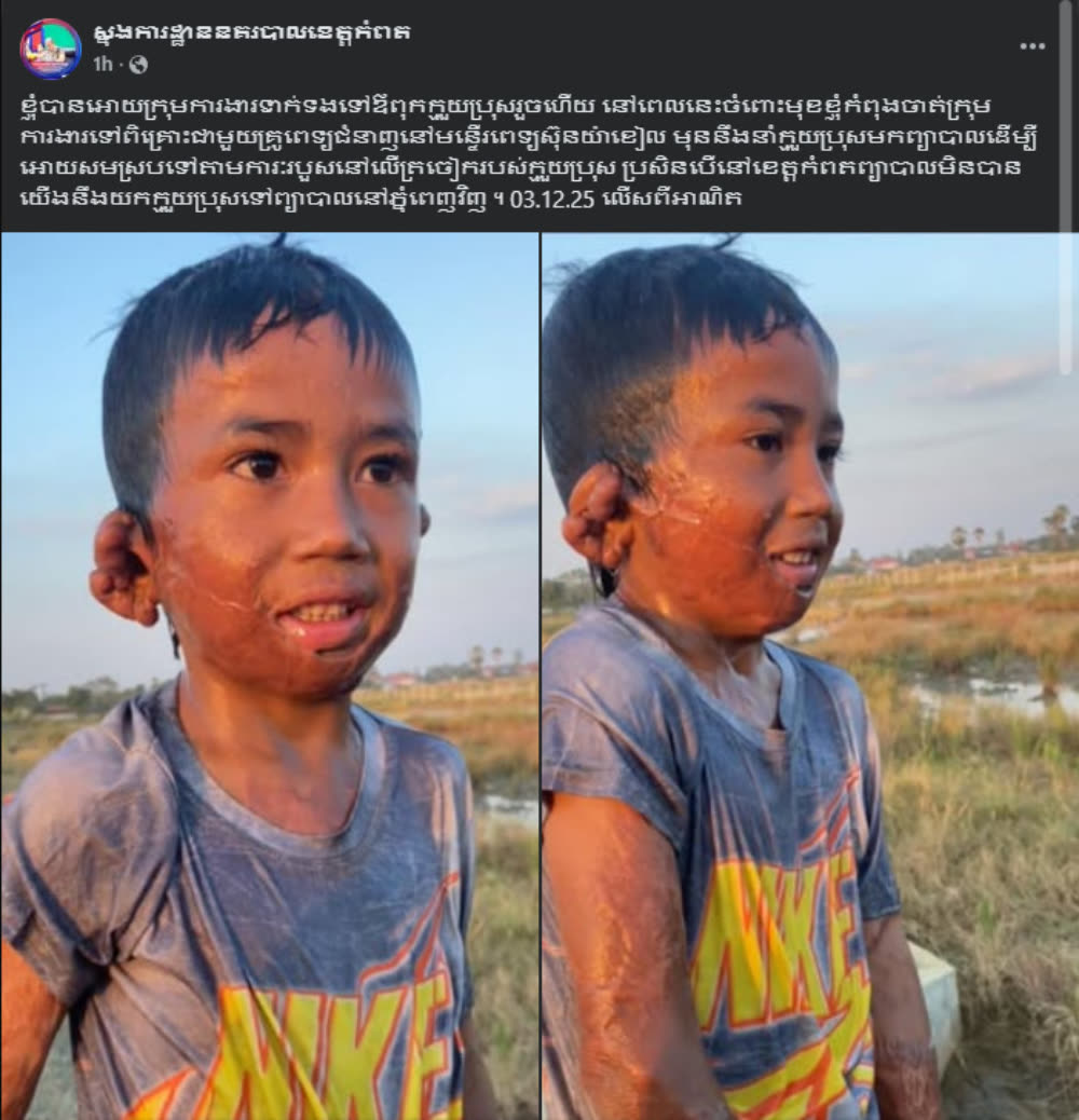 លើលពីអាណិត! ក្រោយមានការចែករំលែកលើបណ្ដាញសង្គម ពីកុមារាម្នាក់មានអាការៈមានបញ្ហាលើត្រចៀកនិងស្បែក ថែមទាំងមើលឃើញពីជីវភាពខ្វះខាតទៀតនោះ ពេលនេះ លោកឧត្តមសេនីយ៍ទោ ម៉ៅ ច័ន្ទមធុរិទ្ធ ស្នងការ នៃស្នងការនគរបាលខេត្តកំពត បានចាត់ឲ្យក្រុមការងារទាក់ទងទៅឪពុកក្មួយប្រុសរួចហើយ នៅពេលនេះចំពោះមុខខ្ញុំកំពុងចាត់ក្រុមការងារទៅពិគ្រោះជាមួយគ្រូពេទ្យជំនាញនៅមន្ទើរពេទ្យស៊ុនយ៉ាខៀល មុននឹងនាំក្មួយប្រុសមកព្យាបាលដើម្បីអោយសមស្របទៅតាមអាការៈរបួសនៅលើត្រចៀករបស់ក្មួយប្រុស ប្រសិនបើនៅខេត្តកំពតព្យាបាលមិនបាន យើងនឹងយកក្មួយប្រុសទៅព្យាបាលនៅភ្នំពេញវិញ។