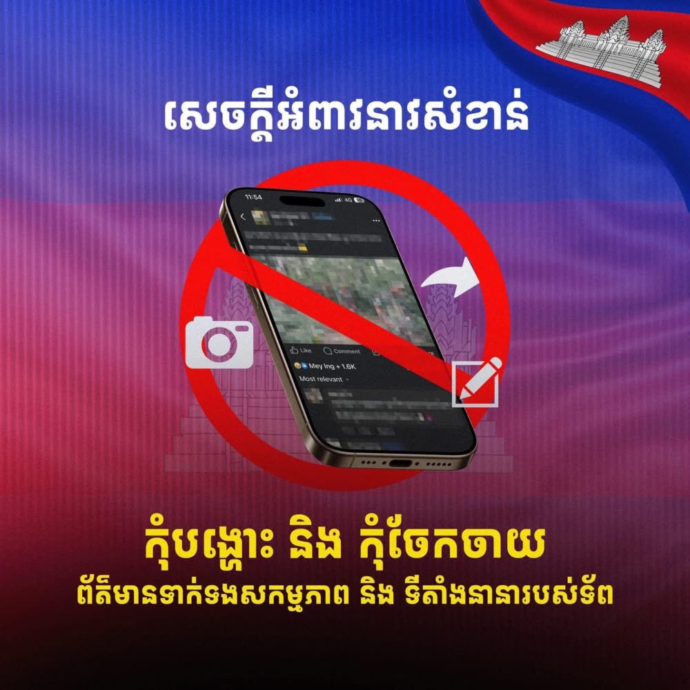 ឯកឧត្តមរដ្ឋមន្ត្រី នេត្រ ភក្ត្រា៖ ក្រសួងព័ត៌មានសូមណែនាំ និងស្នើសាជាថ្មីដល់បងប្អូនអ្នកសារព័ត៌មាន អ្នកធ្វើសកម្មភាពក្នុងវិស័យព័ត៌មាន និងសោតទស្សន៍ ព្រមទាំងអ្នកប្រើប្រាស់បណ្តាញទំនាក់ទំនងសង្គមទាំងអស់ កុំធ្វើការផ្សព្វផ្សាយ និងចែករំលែកព័ត៌មានអំពីទីតាំងឈរជើង ការចល័តទ័ព លេណដ្ឋានកងទ័ព ការប្រើប្រាស់គ្រឿងសព្វាវុធយុទ្ធោប្បករណ៍ និងការសម្ងាត់របស់កងទ័ព ដែលធ្វើឱ្យអន្តរា_យដល់សន្តិសុខជាតិ និងបង្កគ្រោះថ្នាក់ដល់អ្នកបំពេញបេសកកម្មជូនជាតិ។