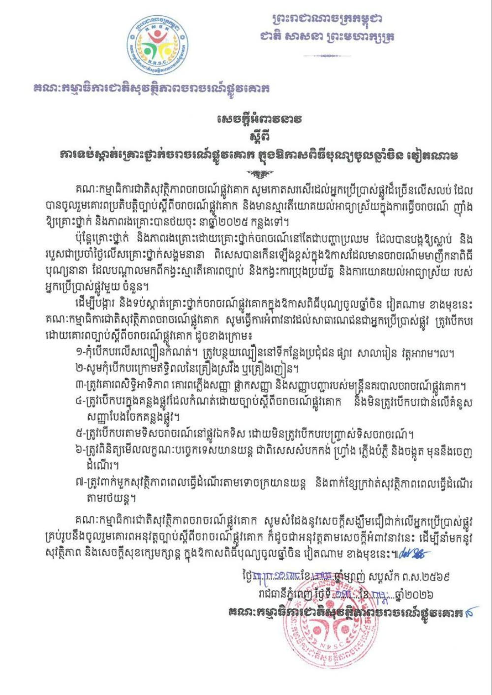 គណៈកម្មាធិការជាតិសុវត្ថិភាពចរាចរណ៍ផ្លូវគោក ចេញសេចក្តីអំពាវនាវ ស្តីពីការទប់ស្កាត់គ្រោះថ្នាក់ចរាចរណ៍ផ្លូវគោក ក្នុងឱកាសពិធីបុណ្យចូលឆ្នាំចិន វៀតណាម៕