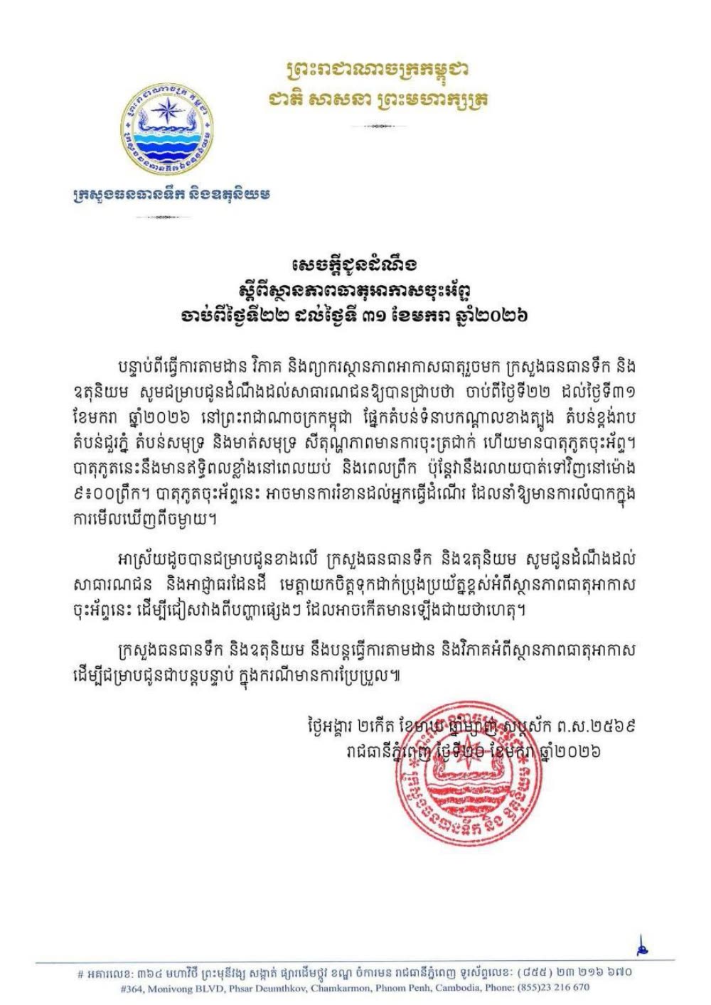 បន្ទាប់ពីធ្វើការតាមដានវិភាគ និងព្យាករស្ថានភាពអាកាសធាតុរួចមក ក្រសួងធនធានទឹក និងឧតុនិយម បានជូនដំណឹងដល់សាធារណជនឱ្យបានជ្រាបថា ចាប់ពីថ្ងៃទី២២ ដល់ថ្ងៃទី៣១ ខែមករា ឆ្នាំ២០២៦ នៅព្រះរាជាណាចក្រកម្ពុជា ផ្នែកតំបន់ទំនាបកណ្តាលខាងត្បូង តំបន់ខ្ពង់រាប តំបន់ជួរភ្នំ តំបន់សមុទ្រ និងមាត់សមុទ្រ សីតុណ្ហភាពមានការចុះត្រជាក់ ហើយមានបាតុភូតចុះអ័ព្ទ។